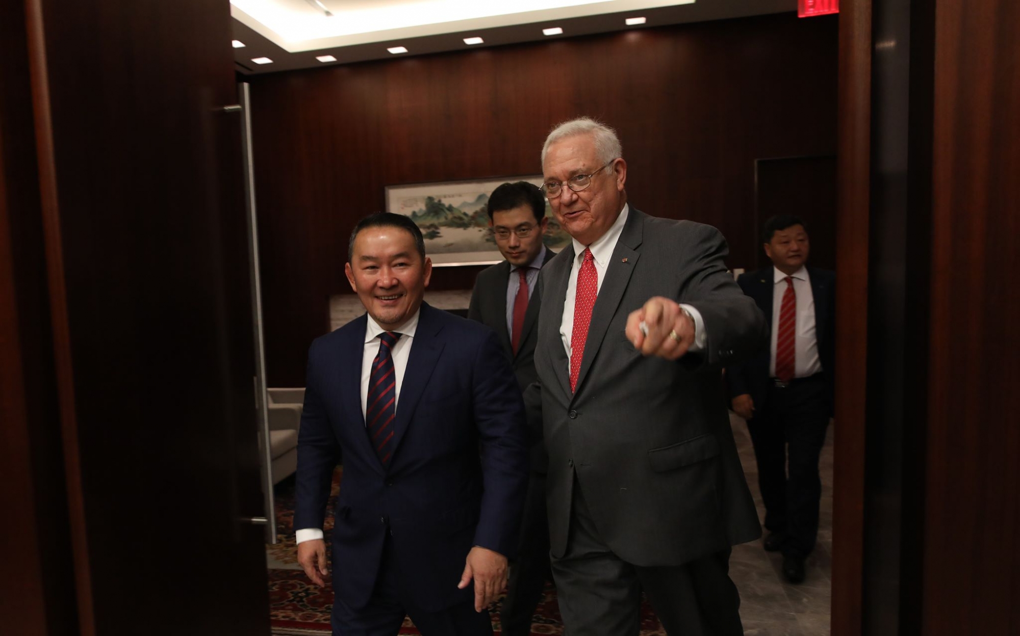 Та бүхэнд шинэ баяртай мэдээ дуулгая. Миний АНУ-д хийж буй энэхүү айлчлалын үеэр манай хоёр улсын харилцааг “шинэ түвшин”-д гаргаж, бид улам ойр, нягт ажиллахаа маргааш зарлах гэж буйдаа баяртай байна. Энэ мэдээ нь ардчилал, хүний эрх, эрх чөлөө зэрэг үнэт зүйлсийг хуваалцаж маш ойр байдаг манай хоёр орны хувьд зүй ёсны ахиц гэж үзэж байна