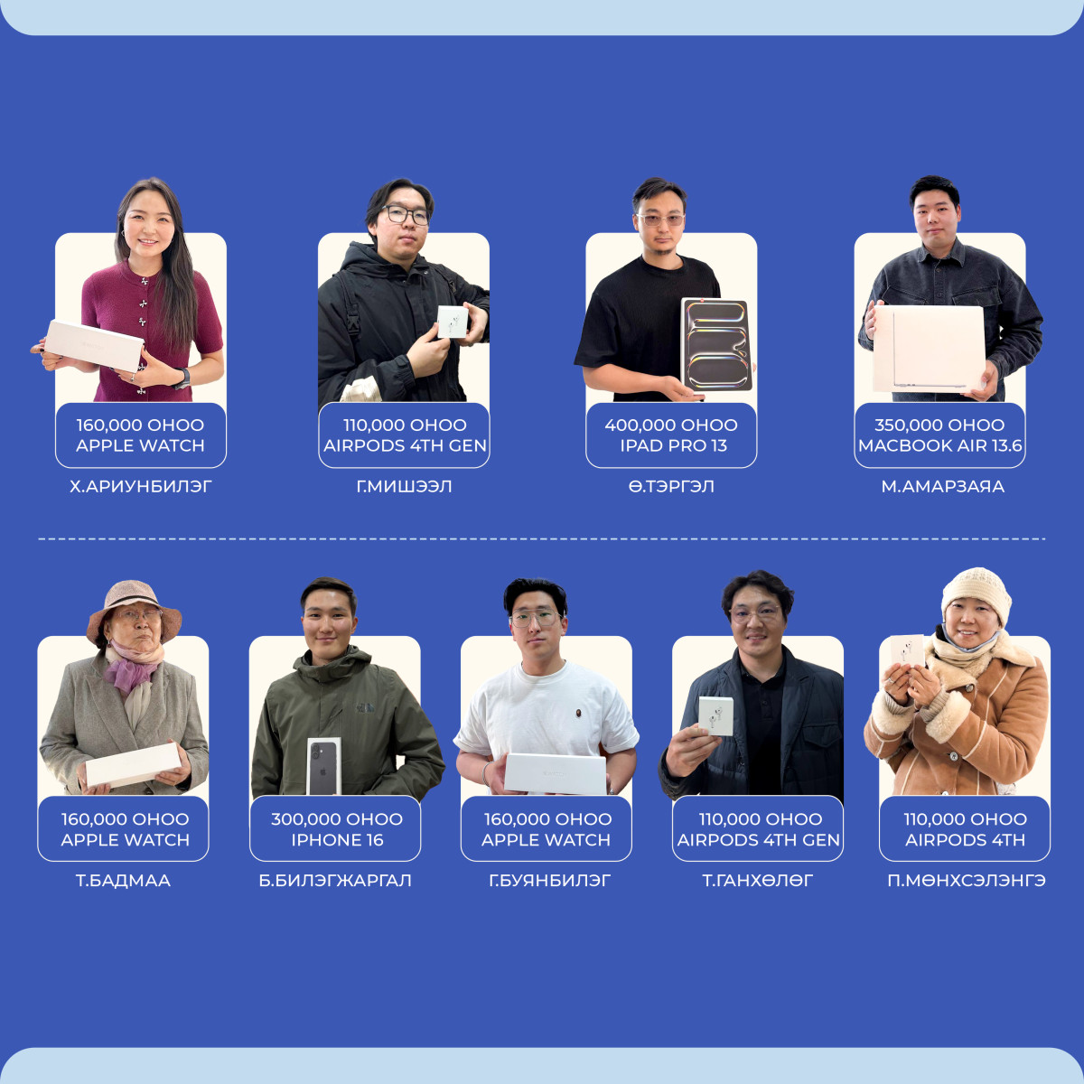 Онооны шатлалаар урамшуулал авах эрх нь нээгдэж буй бөгөөд одоогийн байдлаар нийт 9 харилцагч Apple-ийн бүтээгдэхүүн авснаас хамгийн ихдээ 400,000 оноогоор Ipad Pro 13, хамгийн багадаа 110,000 оноогоор Airpods4 идэвхжүүлж авчээ. Долоо хоног бүрийн Баасан гарагийн 12 цагт SocialPay аппликэйшний “Apple Pay Deal” хөтөлбөр цэсэд Apple-ийн 1ш бүтээгдэхүүн шинээр задарч байгаа ба урамшуулал 2025.06.30-нд дуусах тул танд Apple-ийн бүтээгдэхүүн хожих 4 удаагийн боломж үлдсэн байна.