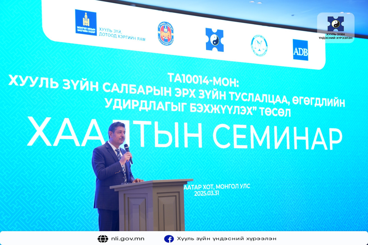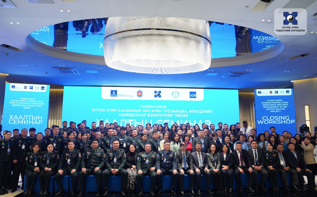 Азийн хөгжлийн банкны Техникийн туслалцааны дэмжлэгтэйгээр Хууль зүйн салбарын эрх зүйн туслалцаа, өгөгдлийн удирдлагыг бэхжүүлэх төслийг 2023-2025 онд амжилттай хэрэгжүүлж дууслаа. Өнөөдөр энэхүү төслийн үр дүнг танилцуулах хаалтын арга хэмжээ болж өнгөрлөө.