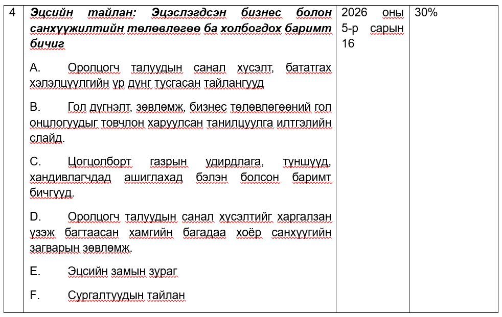 - Санхүүгийн санал (аялалын зардал, уулзалт, хэлэлцүүлгийн зардал багтаасан)