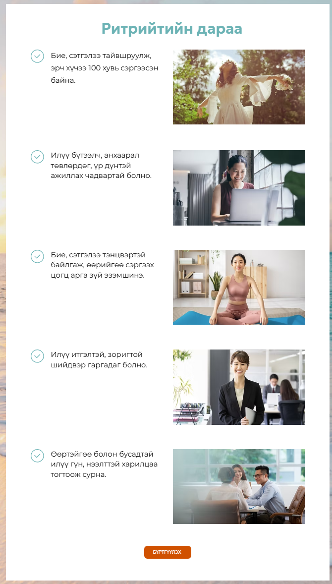 Би ч өөрөө саяхныг хүртэл “Хоёр нялх хүүхэдтэй, энэ их ажлын хажуугаар юун бясалгал, тавин нас хүрээд болъё. Урдах ажлаа л сайн хийвэл болох биш үү” гэж ханддаг байлаа. Гэтэл яг жилийн өмнө ядарч туйлдснаа мэдэрсэн. Олон хүнд сэтгэл зүйн дэмжлэг үзүүлж, зөвлөөд байдаг, гэтэл “Би хаана байна вэ” гэсэн асуулттай тулгарсан л даа. Тэгээд хариултаа олохоор орчноо өөрчлөөд Dr Joe Dispenza-гийн долоо хоногийн “Retreat”-д явж эхэлсэн юм.