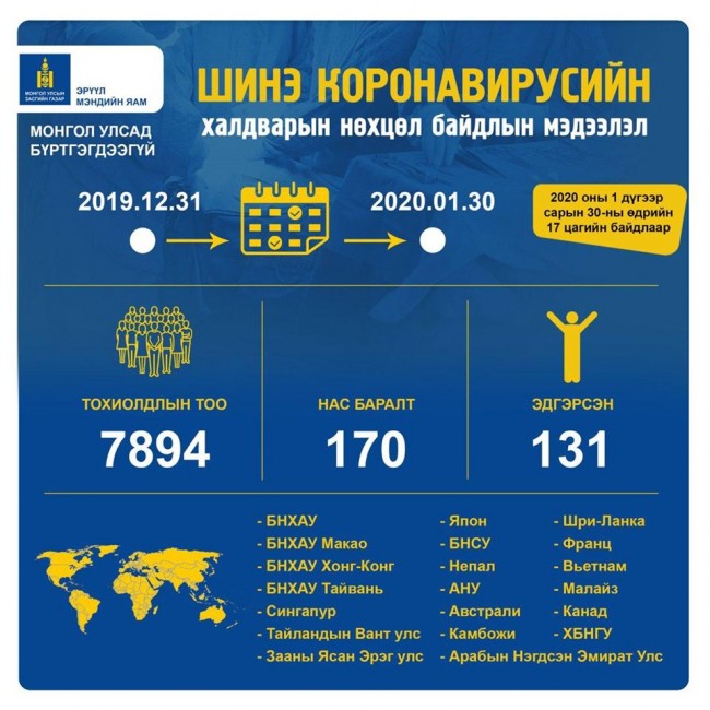 Шинэ коронавирусын халдвар авсан нь батлагдсан хүмүүсийн тоо өнөөдрийн 17.00 цагийн байдлаар дэлхийн хэмжээнд 7894 болжээ. Тэдгээрээс 170 хүн нас барж, 131 хүн эдгэрсэн байна.