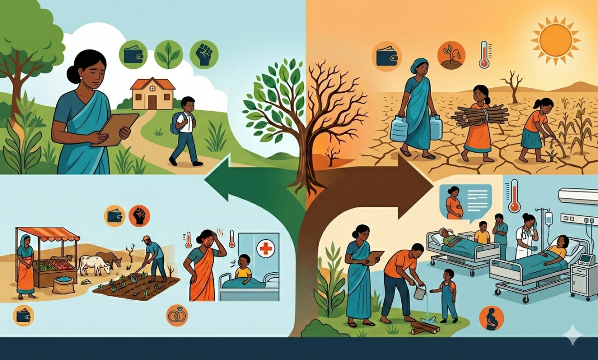 Түүнчлэн, эмэгтэйчүүд гэр бүл, гэрийн ажлыг голлон хариуцдаг учир ус, хоол хүнсний нөөц багасах үед илүү их ачаалалтай тулгардгийг олон улсын судалгаа харуулдаг. Нөгөө талаас, уур амьсгалын өөрчлөлт болох байгалийн гамшиг, зуд болох үед эрэгтэйчүүд мал аж ахуйтай хамаарал их тул санхүүгийн эрсдэлтэй шууд тулгардаг.