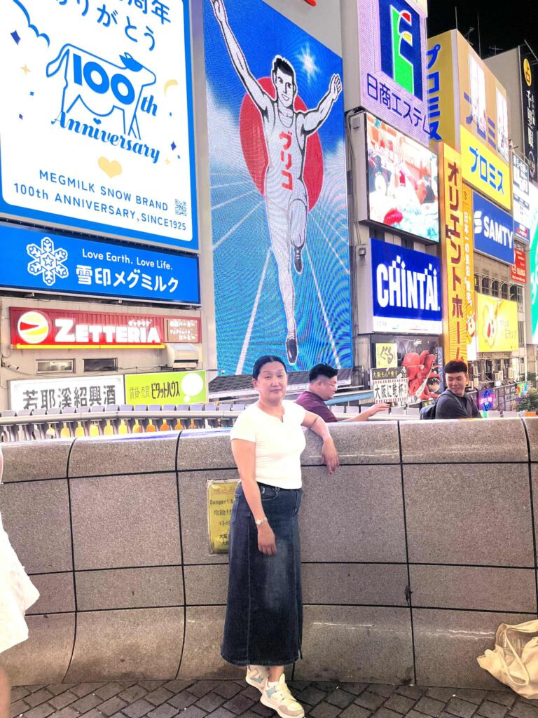 Хоолны газраас гарч ирсээр байтал дуг нойрны цаг юу юугүй дөхжээ. Осакагийн завгүй, шөнийн амьдрал олон өнгөөр анив татав хийх хурц гэрлийн анивчаан дор өөрийн өнгө төрхийг олсон байв. “Осакад ирсэн хүн чухам энд л зургаа татуулдаг” гэхээр нь тэр газарт нь очлоо.