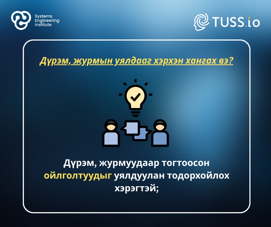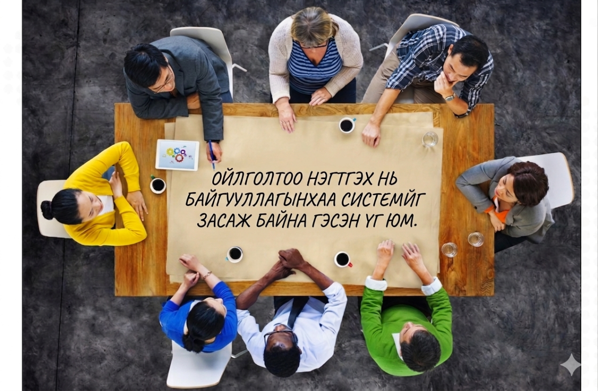 Тиймээс ойлголтоо нэгтгэнэ гэдэг нь зүгээр нэг ойлголцох талаарх асуудал биш. Харин байгууллагынхаа системийг засаж байна гэсэн үг.