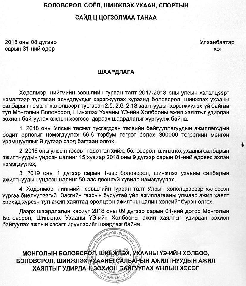 Монголын Боловсрол, шинжлэх ухааны ҮЭ-ийн холбооны ҮЭ-ийн хороо, бүлгийн дарга нарын 2018 оны 8 дугаар сарын 31-ний өдрийн хурлаар Хөдөлмөр, нийгмийн зөвшлийн гурван талт 2017-2018 оны улсын хэлэлцээрийн 3.2 дугаар заалтыг хэрэгжүүлэхтэй холбоотой нэмэлт хэлэлцээрийн холбогдох заалтуудыг үндэслэн хугацаагүй ажил хаялт хийх болсноо өнөөдөр /09.01/ хэвлэлийн бага хурлаар албан ёсоор мэдээллээ.