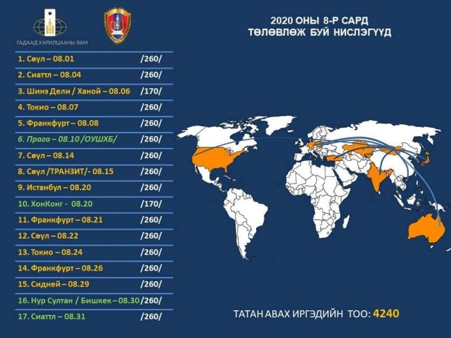 Эдгээр нислэгийг үйлдсэнээр энэ сард нийт 17 удаагийн нислэгээр 4240 гаруй иргэнийг эх оронд нь авчирна.