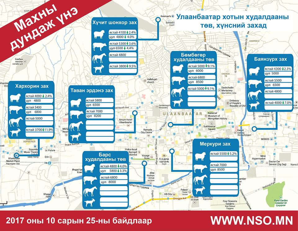 Ингэснээр хонины ястай махны үнэ өмнөх сараас 10.5 хувь, үхрийн ястай махны үнэ 4.8 хувь, үхрийн цул махны үнэ 1.3 хувь, ямааны ястай махны үнэ 13.5 хувь, адууны ястай махны үнэ 6.0 хувиар буурсан байна. Өмнөх 7 хоногтой харьцуулахад хонины ястай махны үнэ өмнөх сараас 2.0 хувь, үхрийн ястай махны үнэ 0.2 хувь, үхрийн цул махны үнэ 0.3 хувь, ямааны ястай махны үнэ 9.4 хувь, адууны ястай махны 2.5 хувиар буурсан байна.