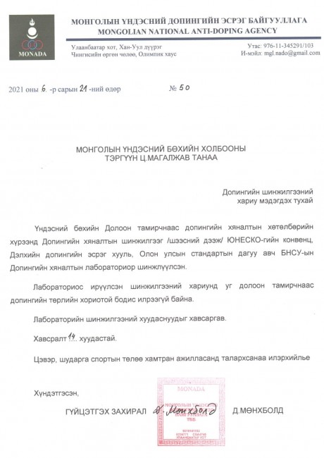 МҮБХ-ны мэдэгдэлд: "2021 оны 03-р сарын 31-ний өдөр 6 бөх, ковид халдварын улмаас 1 бөх 2021 оны 05-р сарын 13-ны өдөр өгсөн болно. Олон улсын допингийн эсрэг байгууллагын БНСУ дахь итгэмжилсэн лаборатори 6 бөхийн шинжилгээний хариуг МҮДЭБ-д 2021 оны 06-р сарын 10-ны өдөр, үлдсэн 1 бөхийн шинжилгээний хариуг 2021 оны 06-р сарын 19-ний өдөр ирүүлсэн байна. МДЭҮБайгууллага шинжилгээний хариуг танилцуулах журмын дагуу бүх шинжилгээг нэгтгэн МҮБХ-нд 2021 оны 06-р сарын 21-ний өдөр ирүүллээ. Шинжилгээгээр бөхчүүдээс допингийн төрлийн ямар нэгэн бодис илрээгүй байна. Цэвэр, шударга өрсөлдөөнийг уриалж байгаа харцагуудадаа спортын өндөр амжилт хүсье" гэв.