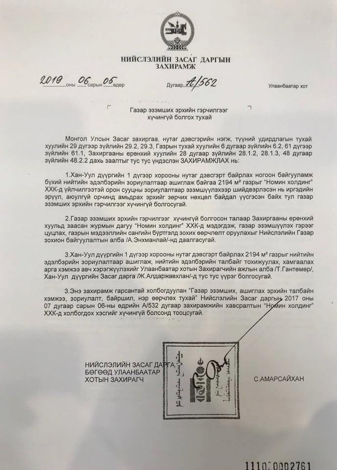 Захирамжид Хан-уул дүүргийн нэгдүгээр хорооны нутаг дэвсгэрт байрлах ногоон байгууламж бүхий нийтийн эдэлбэрийн зориулалтаар ашиглаж байгаа 2194 ам метр газрыг "Номин холдинг" ХХК-д үйлчилгээний зориулалтаар эзэмшүүлэхээр шийдвэрлэсэн нь иргэдийн эрүүл, аюулгүй орчинд амьдрах эрхийг зөрчих нөхцөл байдал үүсгэсэн байх тул газар эзэмших эрхийн гэрчилгээг хүчингүй болгосугай” гэжээ.
