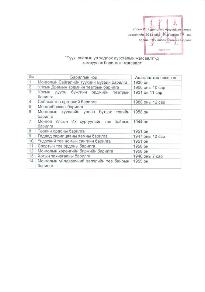Санал хүргүүлэх бичигт “Түүх, соёлын үл хөдлөх дурсгалын жагсаалт”-д хамруулах барилгын жагсаалтыг хавсаргажээ.