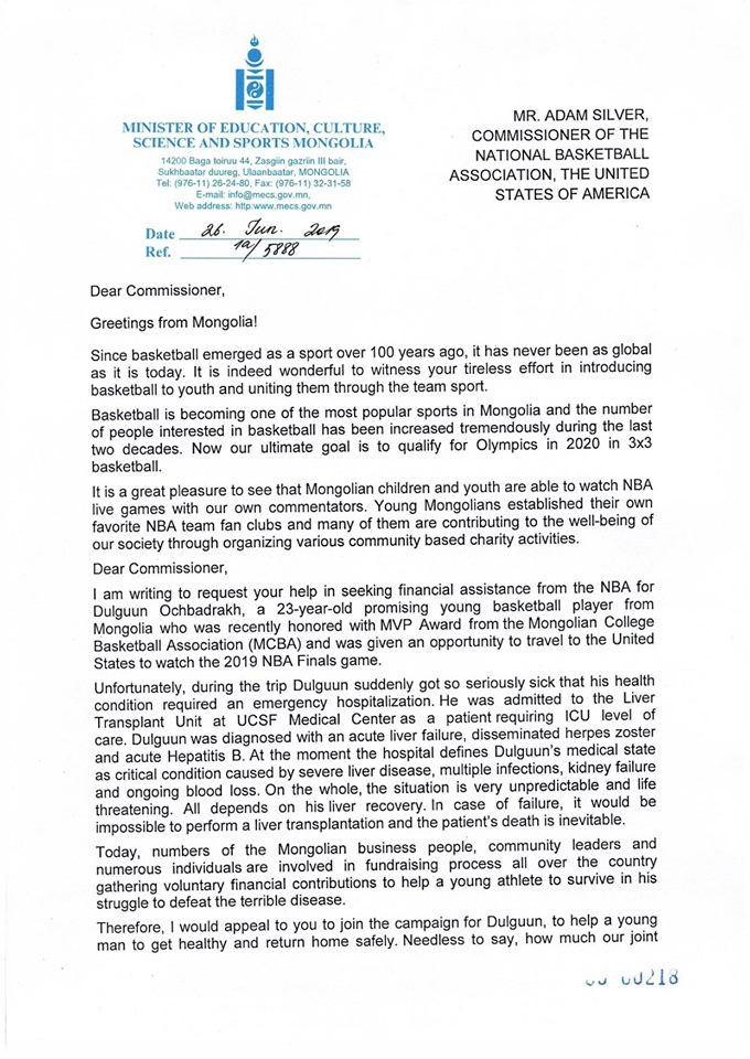 Энэ асуудлаар Боловсрол, соёл, шинжлэх ухаан, спортын яамны хамт олон болон Ё.Баатарбилэг сайд NBA буюу Америкийн сагсан бөмбөгийн холбоонд хандаж хүсэлт илгээжээ.